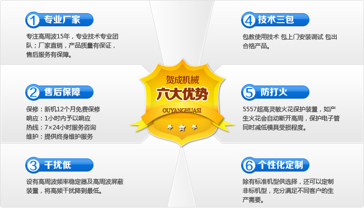 賀成機械專業(yè)生產高周波設備、精制高周波模具、供應高周波配件和耗材、提供高周波維修、高周波加工及高周波出租服務。專注高周波15年,為廣大高周波用戶提供一站式采購、服務平臺。